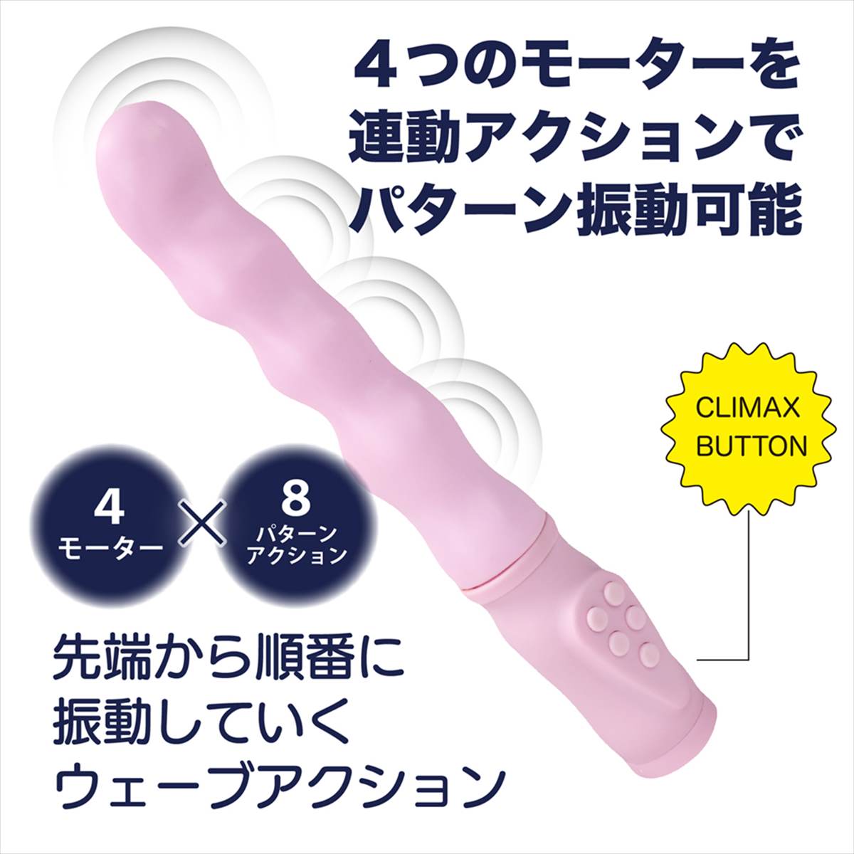4連モーター搭載プレジャーバイブ。先端から根〇まで4つ並んだモーターを個別に操作出来ます。お好みに合わせてそれぞれ3段階の振動強弱+5つのパターン振動を搭載。先端モーターはハイパワー振動にして根〇モーターはパターン振動…等、無限大のパターンでお楽しみ頂けます。さらに一番下のCLIMAXボタンは全モーター振動や根〇から順番に振動していくウェーブ振動等4つの全モーター操作パターンが楽しめます。表面素材もリアルな柔らかさと滑らかな肌心地を再現した特殊TPE素材採用。60分充電で最大90分の長時間使用が可能です。(使用環境により大幅に増減します)