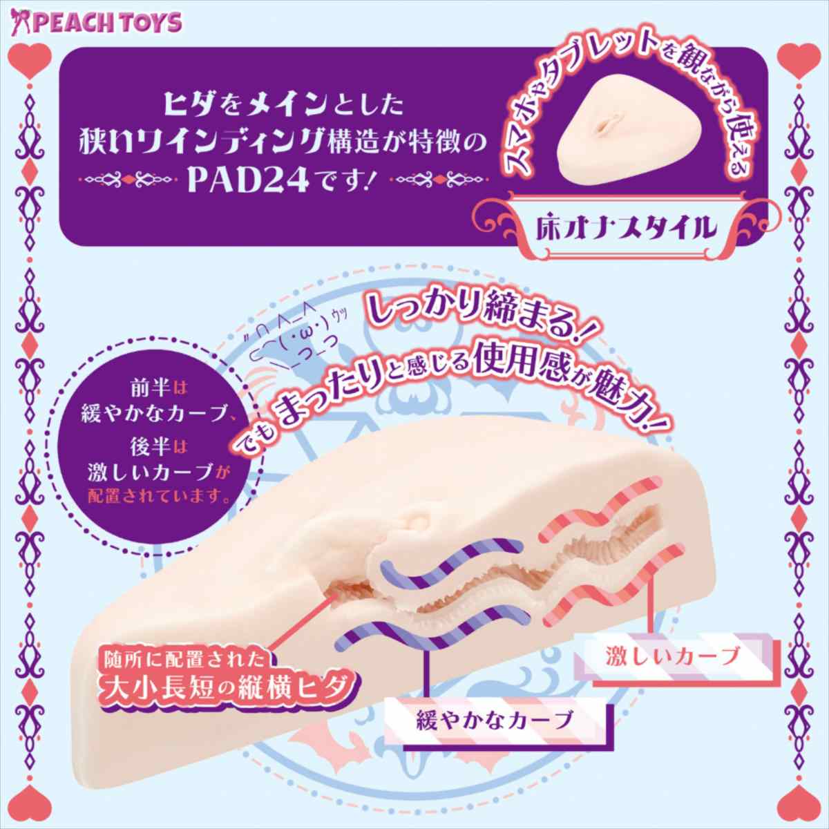 体重に負けない弾力PLUS優しい快感はしっかりと!床オナ式PADシリーズ第10弾「床オナ式PAD24(ユカオナシキパッドトゥーフォー)」が新登場!PAD24の最大の特徴は、締まりの良い「まったり快感構造」!内部は、ワインディング形状で締まりが良く、上下にある大量のヒダでまったりとした自然な快感を楽しめる内部構造を採用。ワインディング構造×上下の大量ヒダ=締まりの良い自然な使用感♪前半は緩やかなカーブ、後半は激しいカーブが配置されています。さらに随所に配置された大小長短の縦横ヒダ!!しっかり締まる!でもまったりと感じる使用感が魅力!お客様からのご意見を参考に、今までの床オナ式PADには無かった「まったり系」内部構造で優しい使用感をお楽しみください。ハンドホールでは味わえない!得られない!満足感はハンパじゃない!PEACHTOYSの床オナ式PADで最高のフィニッシュをお楽しみください♪