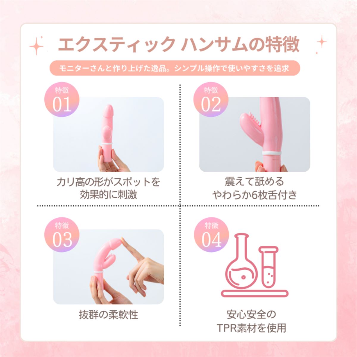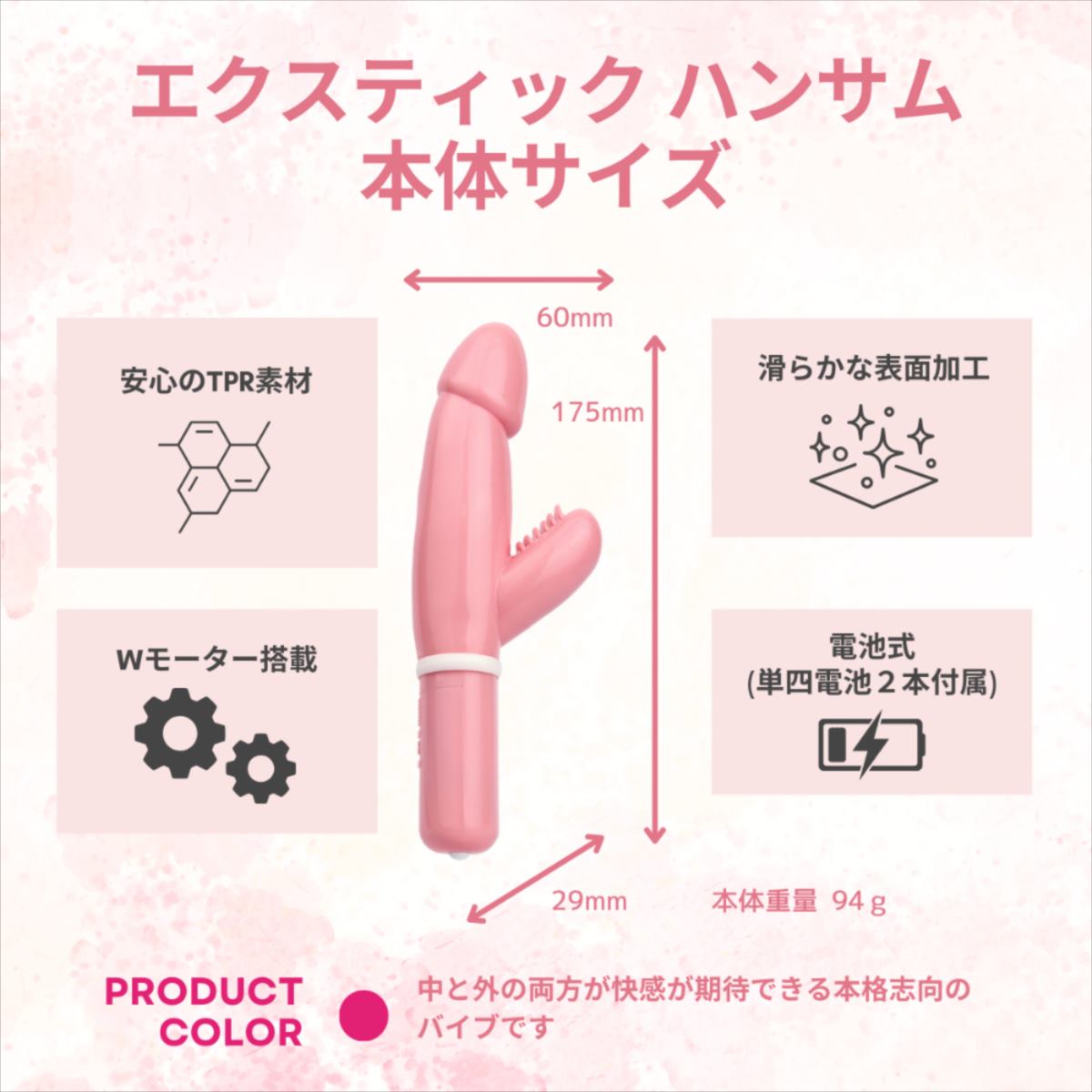 ちょうどイイがきもちイイ!柔らか新感覚バイブ!エクスティックハンサムは、長すぎず、太すぎず、理想的なサイズ。程よい弾力性があり、「本物」のようなリアルな使い心地をお楽しみいただけます。先端の膨らみは、内側を押し上げるように優しくフィット。見た目はシンプルなのにハイクオリティな快感を叶えるバイブレーターです。ビギナーの方や、自分の感じる部分を探したい方にもおすすめです。
