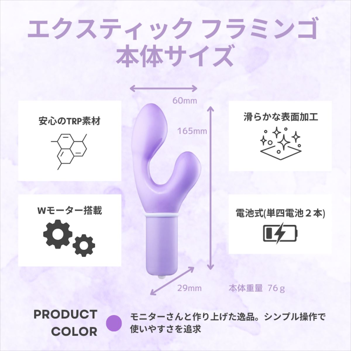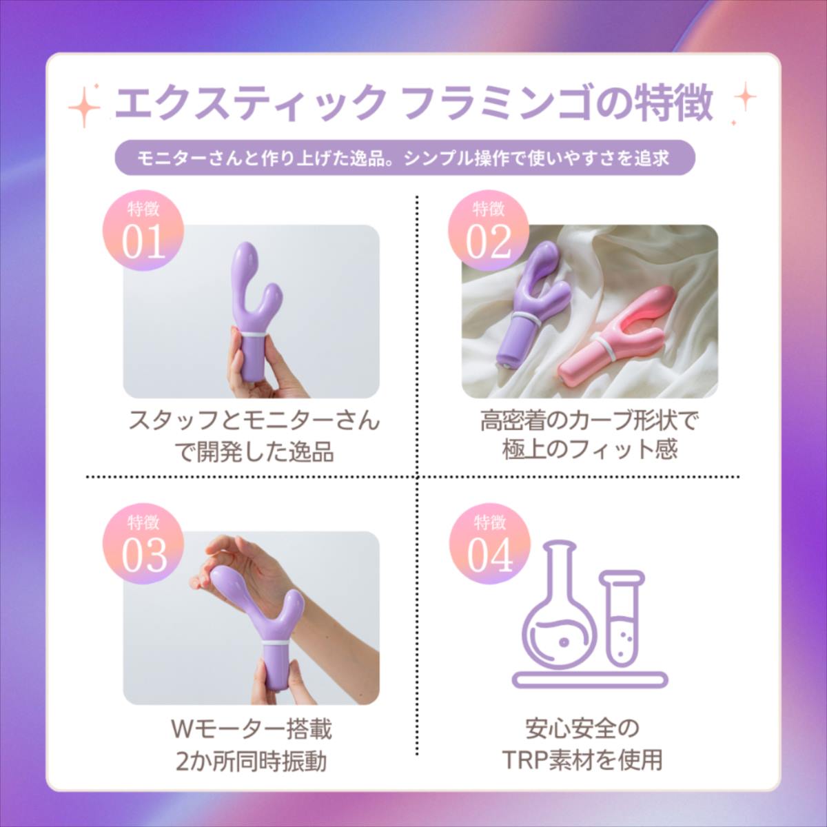 ちょうどイイがきもちイイ!柔らか新感覚バイブ!エクスティックフラミンゴは、女性が感じるために大切な「フィット感」を生み出すために、膨らみ形状にこだわりました。ぷにぷにと柔らかいヘッドは、内側の感じるスポットにピタッとフィットするカタチに設計。高密着カーブ形状で、きもちイイ部分を押し上げるように刺激しながら、吸い付いて離れないような新感覚をお楽しみいただけます。