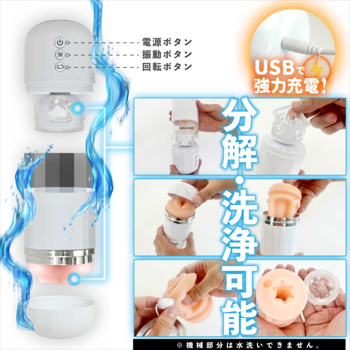 強力バイブと高速回転が生む複合的超快感。2つの快感を1つにまとめた新機軸の電動ホール。振動と回転、2つの独立した動きを兼ね備えた電動ホールです。サ●部分は10パターン切り替え可能な強力バイブレーション機能。先端部分は5パターンの回転が選べるローリング機能を搭載。2箇所の動作をそれぞれコントロールできるので、好みにピッタリな刺激が見つかります。直感的に操作できるシンプルボタンでプレイに集中できます。またパーツごとに分解できるので洗浄しやすく清潔に保てます。