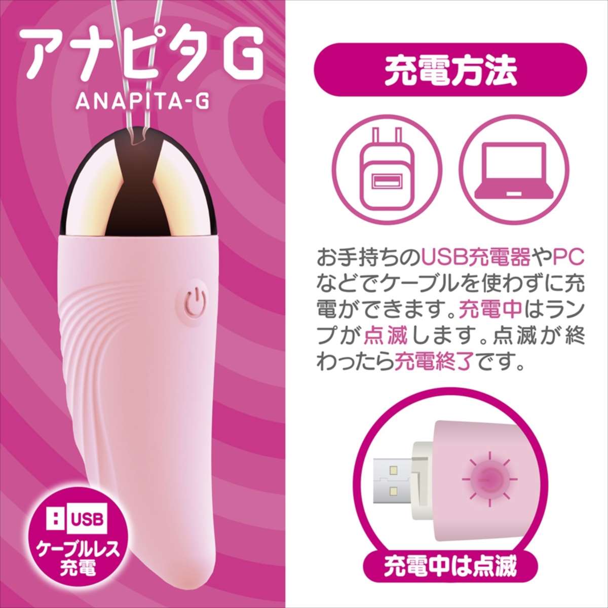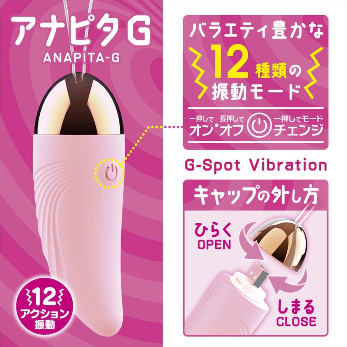 シリコンの柔らかな先端がG●ポットにピタッと届いてぶるぶる震えちゃう!12アクション振動を搭載したケーブルレス充電のお手軽ローター。生活防水仕様の為、清潔に保管出来、収納ポーチも付属しています。操作もボタン一つで電源とモードチェンジが可能。
