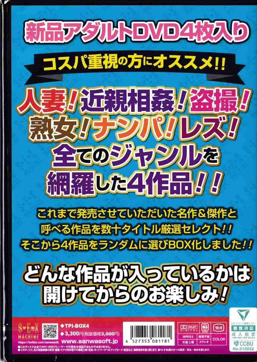 新品アダルトDVD4枚入り コスパ重視の方にオススメ !! 人妻!近親相姦!盗撮!熟女!ナンパ!レズ!全てのジャンルを網羅した4作品!! これまで発売させていただいた名作&傑作と呼べる作品を数十タイトル厳選セレクト!!そこから2作品をランダムに選び商品化しました!! どんな作品が入っているかは開けてからのお楽しみ!! 審査番号284369