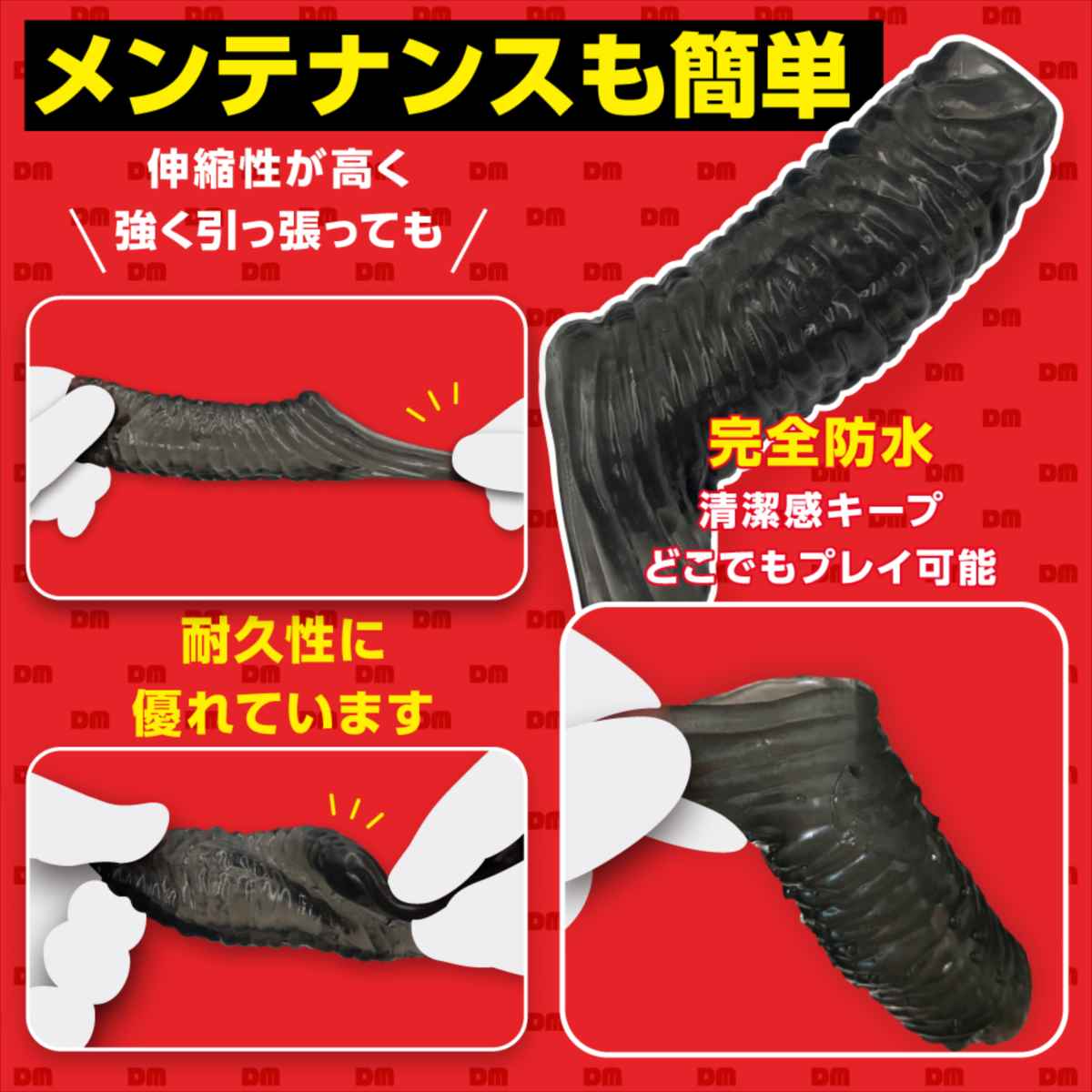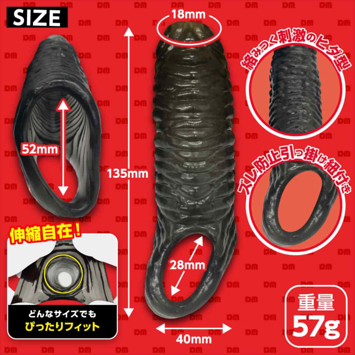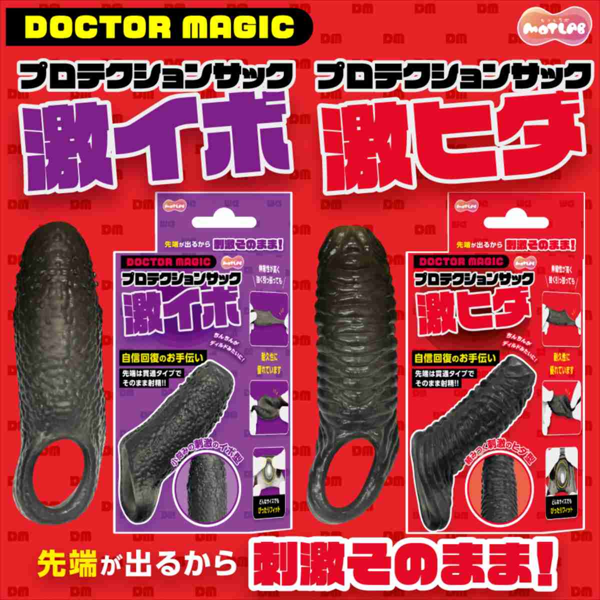 太く逞しいサ●でパートナーの絶頂を、先端露出で自分自身の快感を。2人とも満足できる貫通型サック!先端に穴が開いており、先っちょを露出することができるサックです。装着する事で普段より太く逞しいサ●を手に入れることができます。先端を露出できる貫通型なので、装着者自身も快感を得られ、そのまま発射することも可能です。「激ヒダ」は表面に有機的な横ヒダがびっしり搭載されており、ストロークのたびにパートナーの内壁を強力に擦り上げます。引っ掛け紐が付いているのでプレイ中に外れる心配もありません。