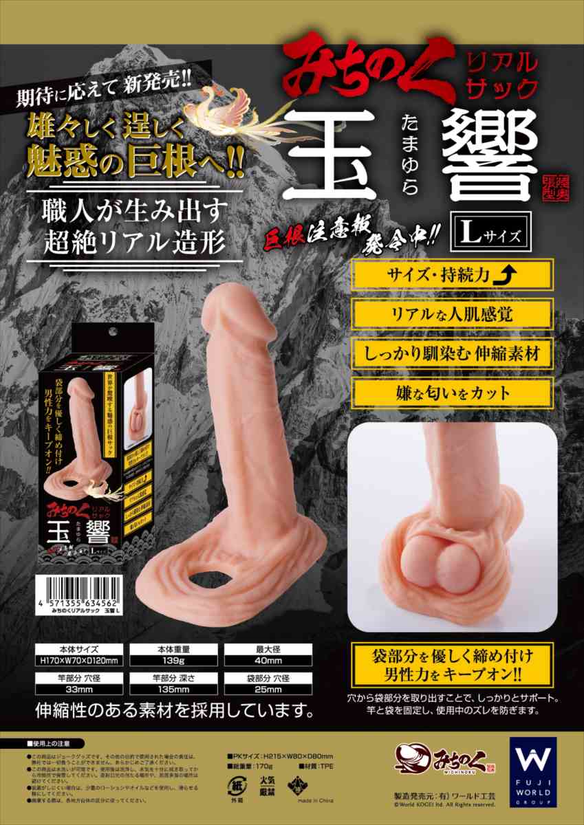 大好評の「みちのくリアルサック玉響M」。大きいサイズが欲しいとのご要望に応え、Lサイズの登場です。この「みちのくリアルサック玉響L」はリアルな造形と、使用感にこだわった実用的な商品です。他のみちのくシリーズ同様、職人のこだわりが詰まった「リアル」と「快楽」の共演を演出する造形に仕上げました。魅惑の巨根へとサイズアップをしつつ、自然な使用感を目指しています。また袋部分を穴に通し優しく締め付ければ、若く元気なあの頃を思い出すでしょう。素材は馴染みやすい伸縮素材を採用し、リアルな人肌感を味わう事が可能です。匂いはほぼなく、使用中に気になることもありません。雄々しく屹立した様はまさに男が夢見る巨根!そんな男性諸氏の願いを叶える逸品です。