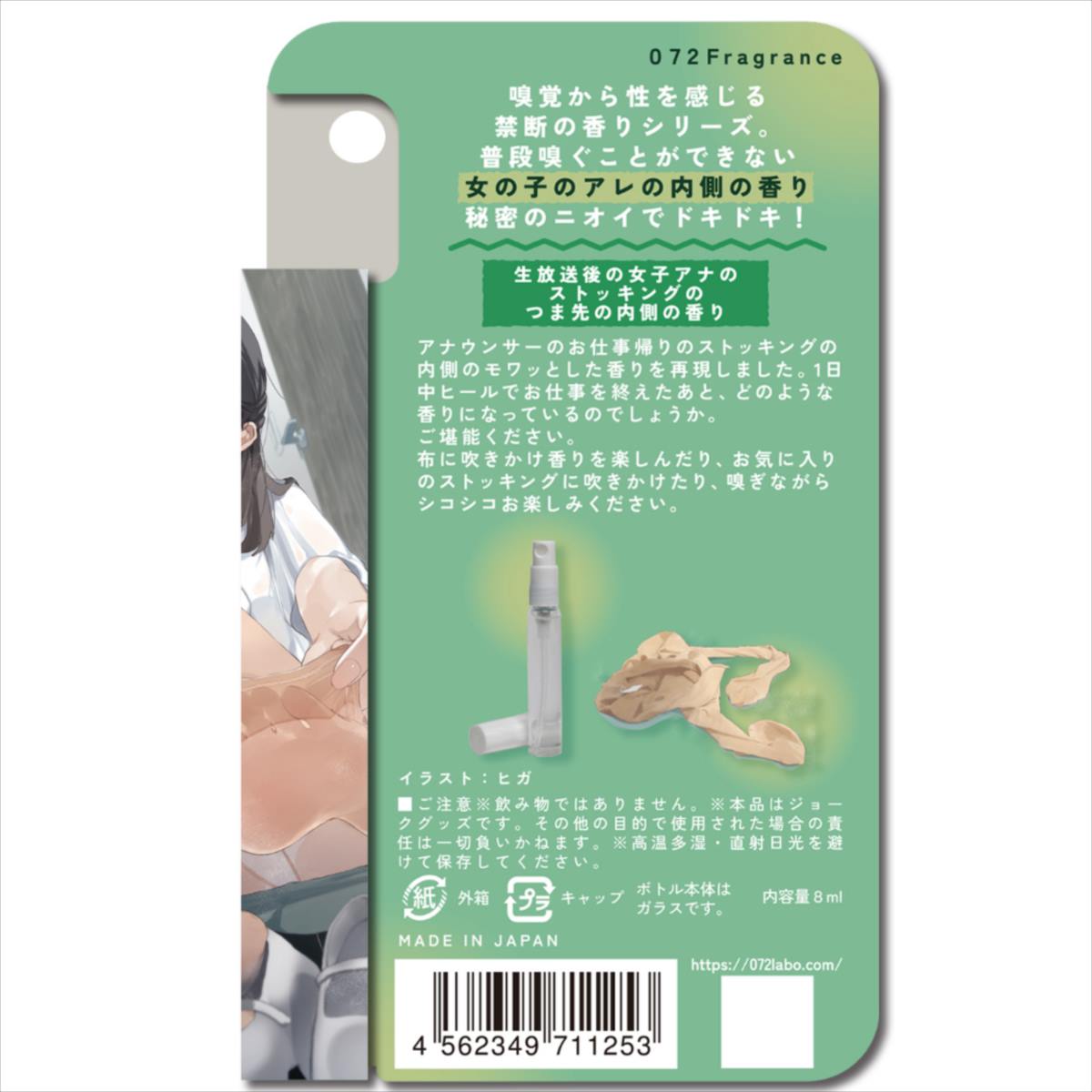 ●嗅覚から性を感じる禁断の「アレの内側の香り」シリーズ。●普段嗅ぐことができない女の子の内側の香り。●アナウンサーのお仕事帰りのストッキングの内側の香りを再現しました。●1日中ヒールでお仕事を終えたあと、どのような香りになっているのでしょうか。ご堪能ください。●布に吹きかけ香りを楽しんだり、お気に入りのストッキングに吹きかけたり、嗅ぎながらシコシコお楽しみください。●イラスト:ヒガ