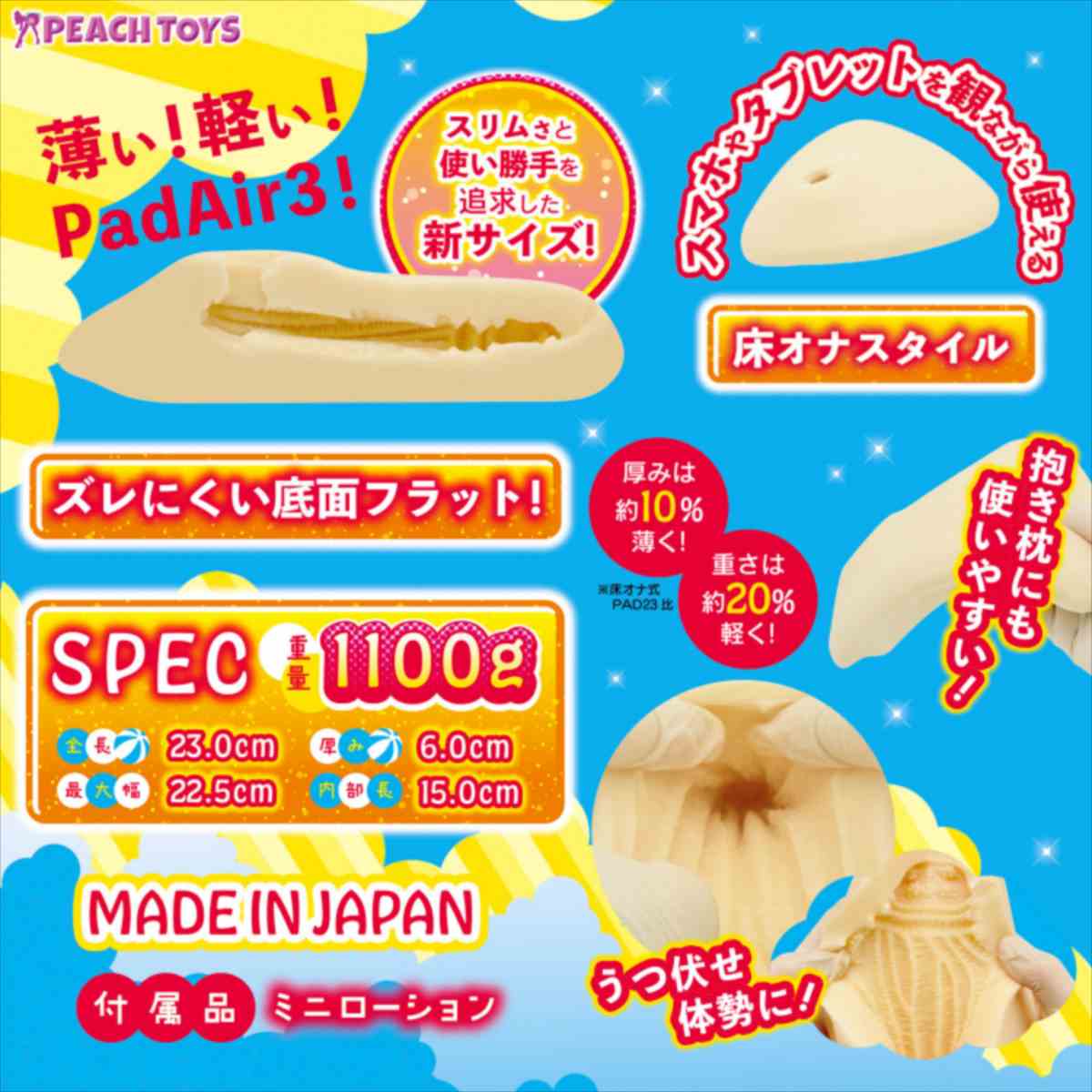 床オナ式PADAirに新しく「PADAir3(パッドエアースリー)」誕生!「体重に負けない弾力×快感はしっかりと」好評の床オナ式PADシリーズのコンセプトはそのままに、より多くの方に楽しんでいただけるギリギリのコンパクトサイズを追求。厚みは約10%薄く、重さは約20%軽く(床オナ式PAD23比)穴の全体形状は、既存の床オナ式PADと遜色のないサイズ感。体重を掛けても裂けにくい厚みのある入口!こんなのが欲しかった!!ベーシックな内部構造でありながら裏切らない万人受けを目指した床オナ式PadAir3。キツめの内部にしっかりとしたトルネード縦ヒダで構造をデザイン。前半で楽しんだ後は後半のリングポイントでフィニッシュ出来ちゃいます。決して派手では無いですが、安定感のあるちゃんと気持ちイイ内部構造です。薄くて軽くて使いやすい床オナ式PADAir3で、心も身体も軽やかにお楽しみください!