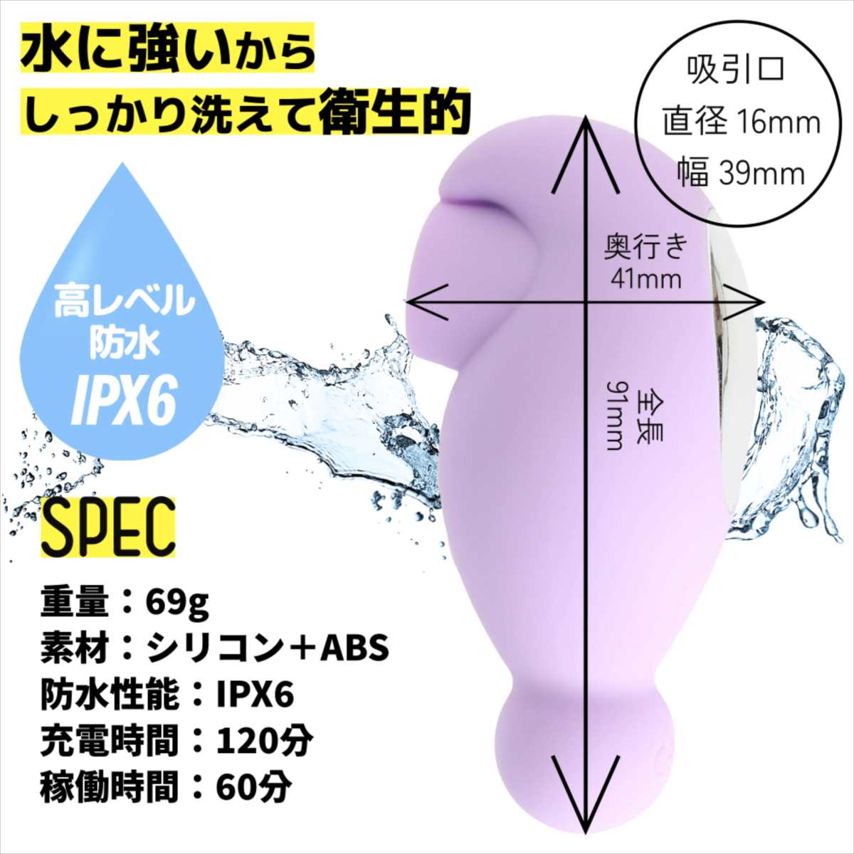 吸引しながら振動!2つのシゲキを同時に楽しめる外イキ特化グッズ。吸引口の上部にマイクロモーターを搭載する事で吸われながらブルブル刺激のWアクションを演出!吸引アクションは強弱3段階+4パターンの計7ファンクション、振動アクションは細かく調整できる強弱5段階+実用性の高い7パターンの計12ファンクション、さらに吸引と振動アクションをそれぞれパターン操作出来るのでお好みの組み合わせをチョイスして楽しむことができます。吸引口も真空刺激が伝わりやすい直径16mmに設計。本体サイズも全長10cm以下に抑えてコンパクトなため持ちやすく、重量も69gとかなり軽量なので手が疲れにくいです。プレイの邪魔をしない静音設計+使用後にしっかり洗えるIPX6の高レベル防水等級のため衛生的に長くお使い頂けます。120分の充電で最大60分の連続使用が可能(使用環境により大幅に増減します。)滑らかで肌心地の良いシリコンボディと使いやすさと実用性を両立させた外責め専用グッズです。