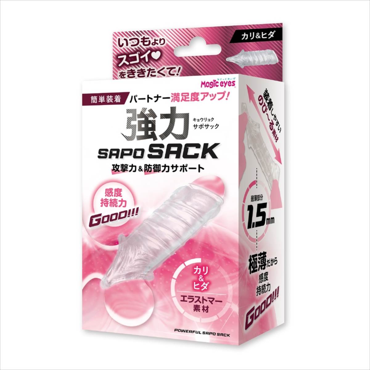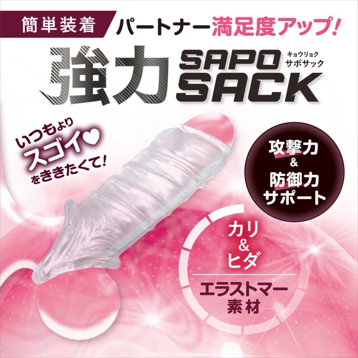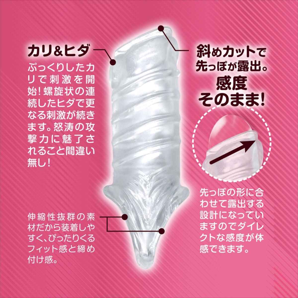 攻撃力と防御力を同時にサポート!素材はエラストマーなので伸縮性があり幅広いサイズの方にご使用頂けます。無限ドット、螺旋ヒダ、異次元ループ、カ●&ヒダの4種の中からお好み刺激をパートナーと楽しんでください。