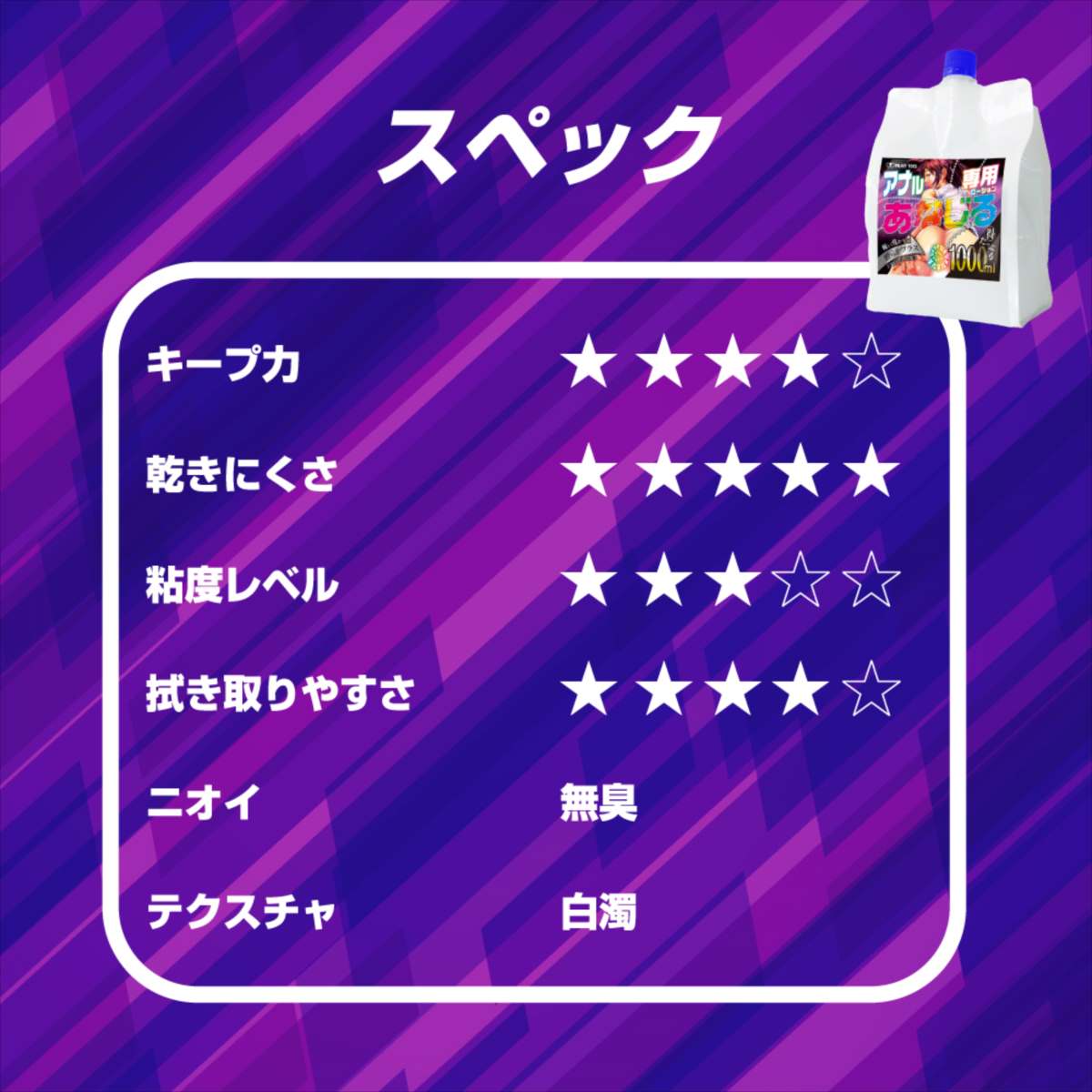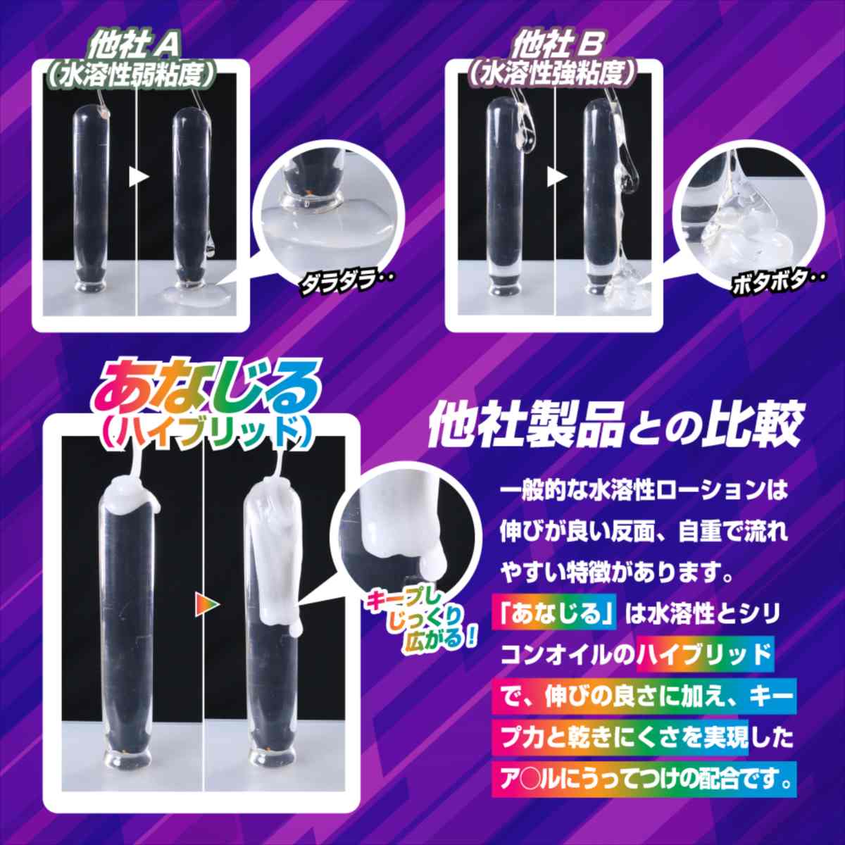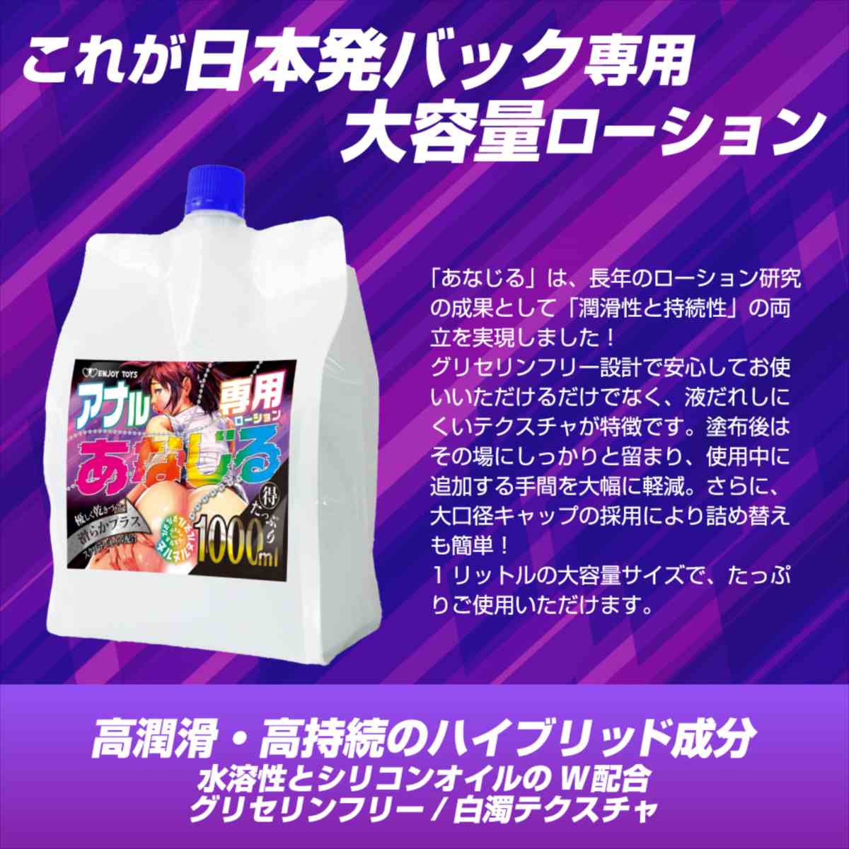 ア●ルを研究し開発したア●ル特化仕様ローション!1リットルの大容量タイプでたっぷりと楽しめます。「あなじる」は、長年のローション研究の成果として「潤滑性と持続性」の両立を実現しました。グリセリンフリー設計で安心してお使いいただけるだけでなく、液だれしにくいテクスチャが特徴です。塗布後はその場にしっかりと留まり、使用中に追加する手間を大幅に軽減。さらに、大口径キャップの採用により詰め替えも簡単。1リットルの大容量サイズで、たっぷりご使用いただけます。