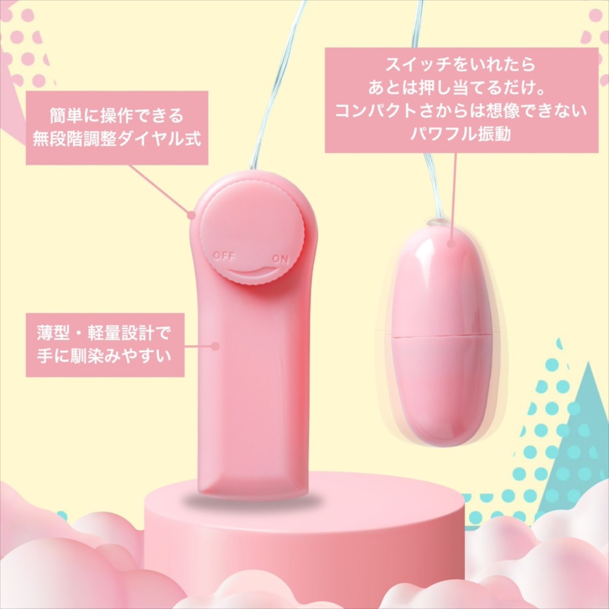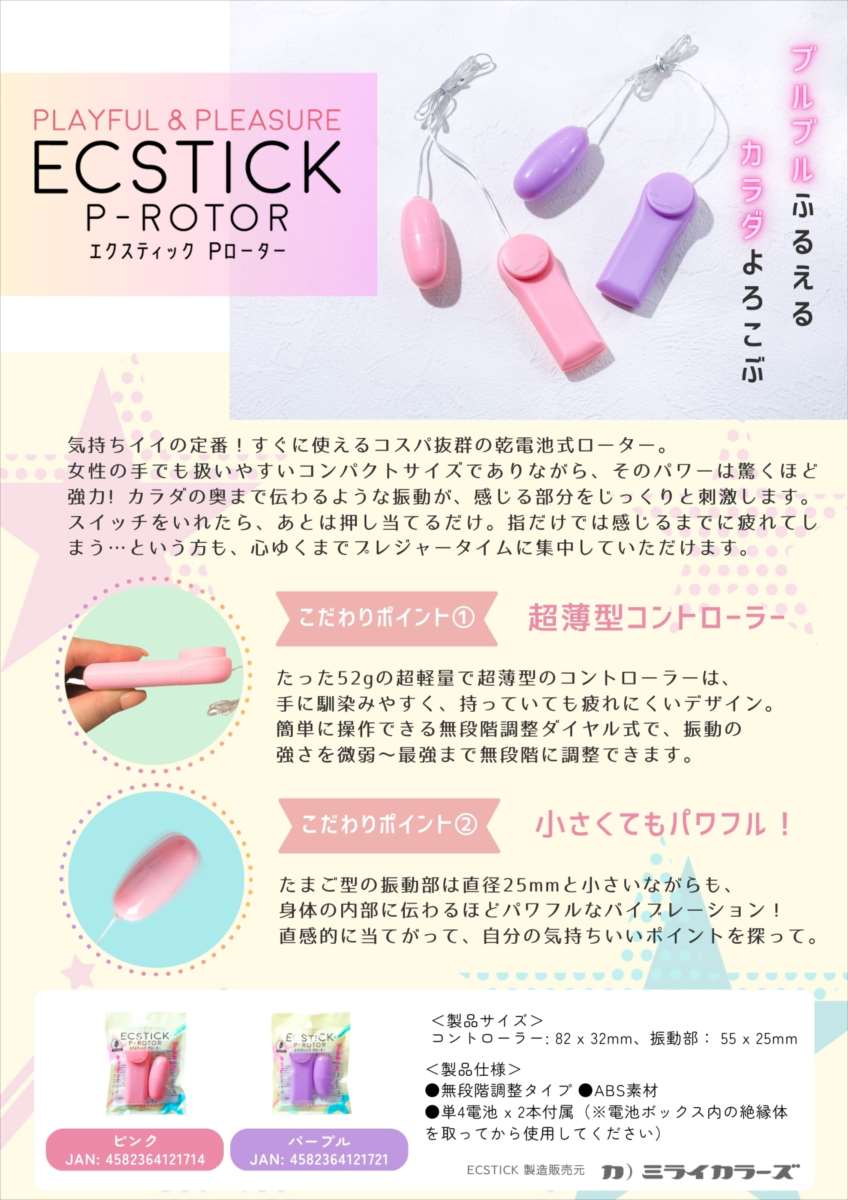 ブルブルふるえる、カラダよろこぶ。気持ちイイの定番!すぐに使えるコスパ抜群の乾電池式ローターです。女性の手でも扱いやすいコンパクトサイズでありながら、そのパワーは驚くほど強力!カラダの奥まで伝わるような振動が、感じる部分をじっくりと刺激します。スイッチをいれたら、あとは押し当てるだけ。指だけでは感じるまでに疲れてしまう…という方も、心ゆくまでプレジャータイムに集中していただけます。コントローラーは指1本で簡単に操作できる無段階調整ダイヤル式で、振動の強さを微弱〜最強まで無段階に調整できます。余計なことを考えず直感的に操作できるので、どなたでも扱いやすい仕様です。軽量で薄型設計で手に馴染みやすく、持っていても疲れにくいのもポイント。ひとりで使ってよし、ふたりで使ってよし。快感開発のファーストグッズをお探しの方からプレジャータイムを今よりもっと楽しみたい方まで幅広い用途にお使いいただけるアイテムです。
