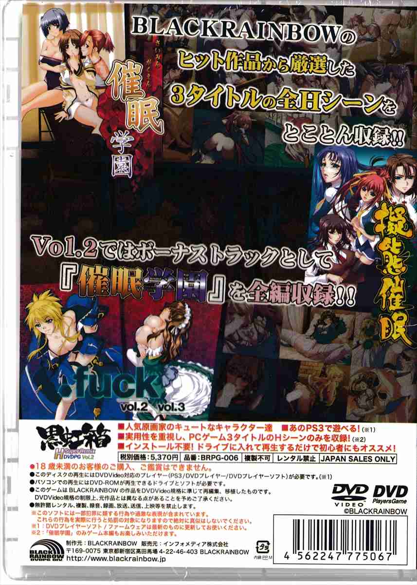 BLACKRAINBOWのタイトルから「催●学園」「擬態催●」、「.fuck」から「咲夜編」「レン編」をピックアップし、これらの作品の「全Hシーン」をこれでもかと収録!Vol.2ではボーナストラックとして「催●学園」を全編収録!抜き特化DVDPGの決定版第二弾が登場!