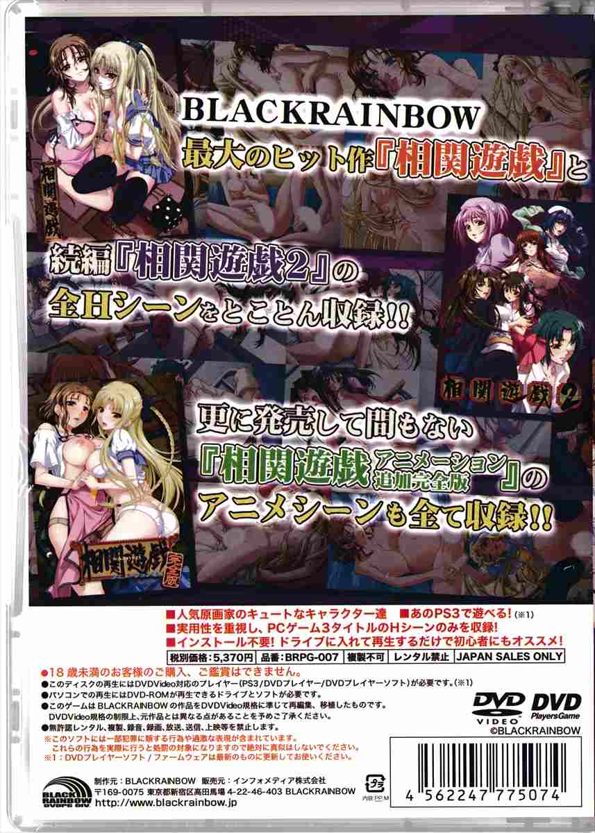 BLACKRAINBOW最大のヒット作「相関遊戯」とその続編「相関遊戯2」の「全Hシーン」をこれでもかと収録!さらに発売して間もない「相関遊戯 アニメーション追加完全版」のアニメーションも全て収録!抜き特化DVDPGの決定版第三弾が登場!