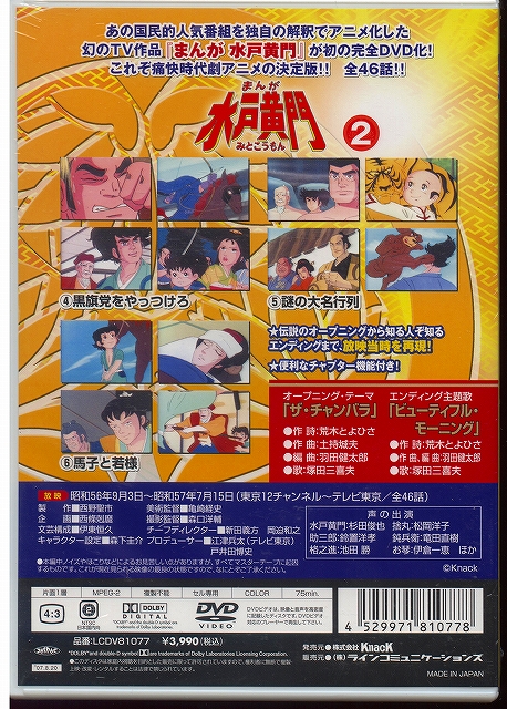 人気TV番組『トリビアの泉』でも紹介され話題となった、知る人ぞ知る幻の時代劇アニメ第2巻。水戸黄門一行が、旅の途中でさまざまな事件を解決する。キャラクターデザインは「マジンガー」シリーズを手掛けた森下圭介。第4話から第6話までを収録。
