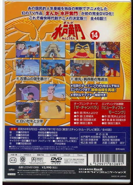 バラエティ番組『トリビアの泉』で紹介され、話題を集めた『まんが水戸黄門』。助さんを二枚目の剣士に、格さんを怪力の持ち主にするというユニークなアレンジのほか、三つ葉葵の印籠を悪人どもに見せるおなじみの名シーンも、アニメならではのダイナミックな演出がなされている。第40話から第42話を収録。