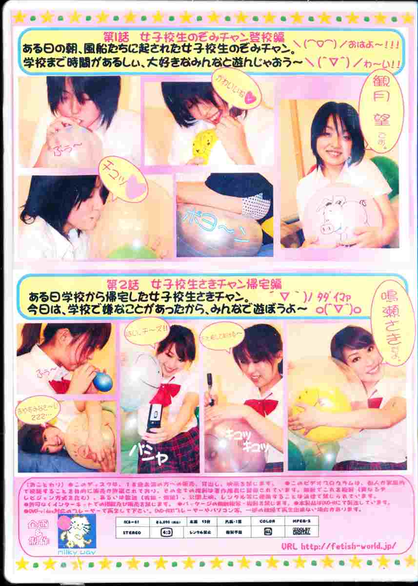 ふうせんフェチ新レーベルmilky wayから第1弾作品の登場です!! その名もCuty Baloon!! ふうせんをまるでペットのように可愛がる女の子がふうせんを抱きしめたり、チュウしたりする姿で萌えちゃってください!! 今回はおまけ映像つき!!